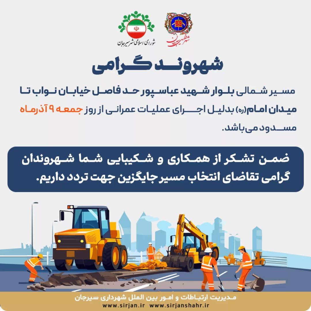 مسیر شمالی بلوار شهید عباسپور حدفاصل خیابان نواب تا میدان امام(ره) بدلیل اجرای عملیات عمرانی از روز جمعه ۹ آذرماه مسدود میباشد.