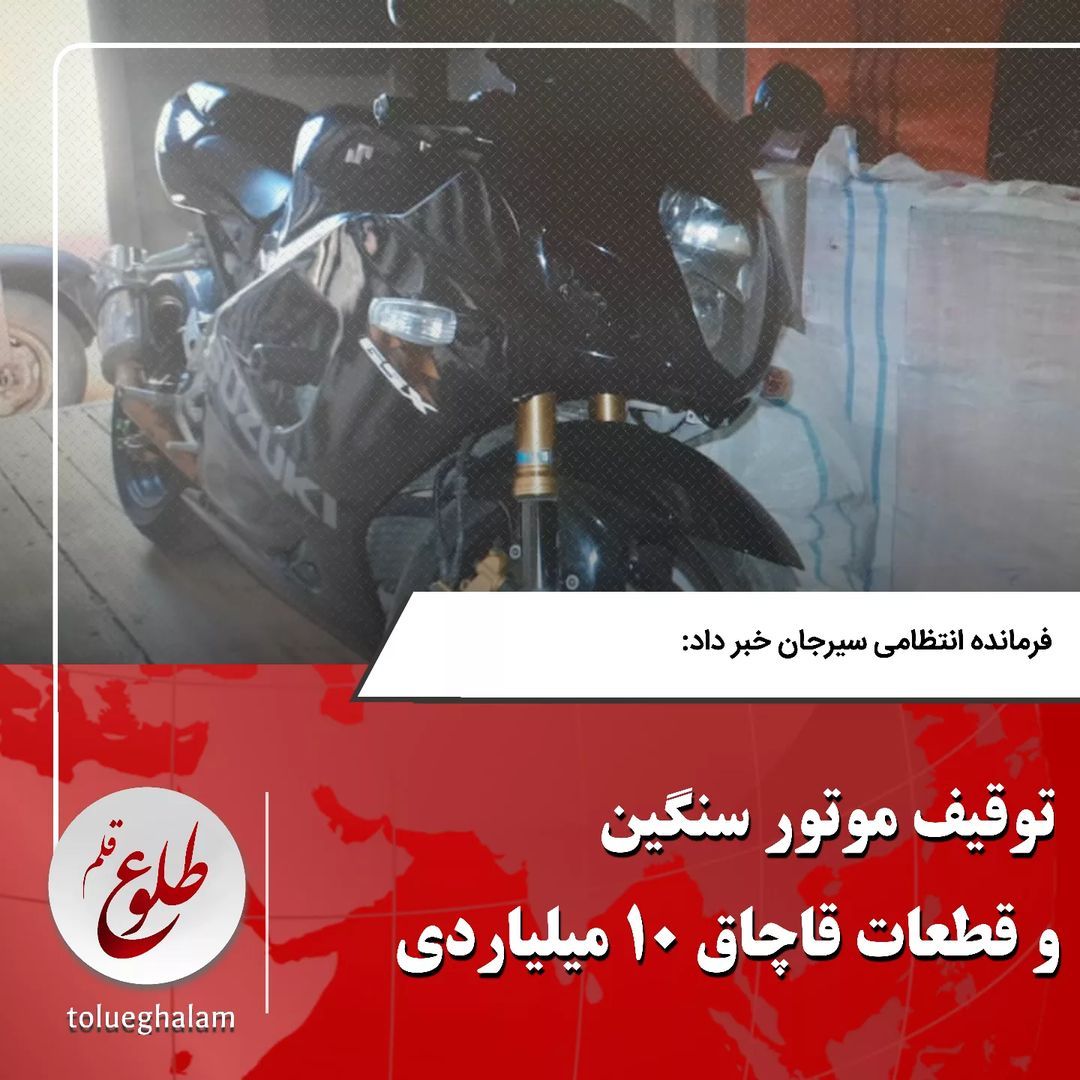 فرمانده انتظامی شهرستان سیرجان از توقیف یک دستگاه موتور سیکلت سنگین و تعدادی قطعات قاچاق مرتبط با آن به ارزش ۱۰ میلیارد ریال خبر داد.