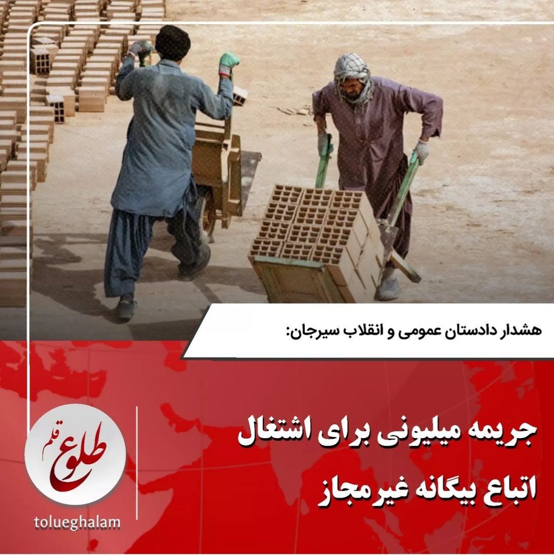 دادستان عمومی و انقلاب سیرجان در این خصوص گفت وزارت کار میزان جدید جریمه کارفرمایانی که از خدمات اتباع خارجی غیر مجاز و فاقد پروانه کار استفاده میکنند را حدود ۱.۲ میلیون تومان به ازای هر روز تعیین کرد.