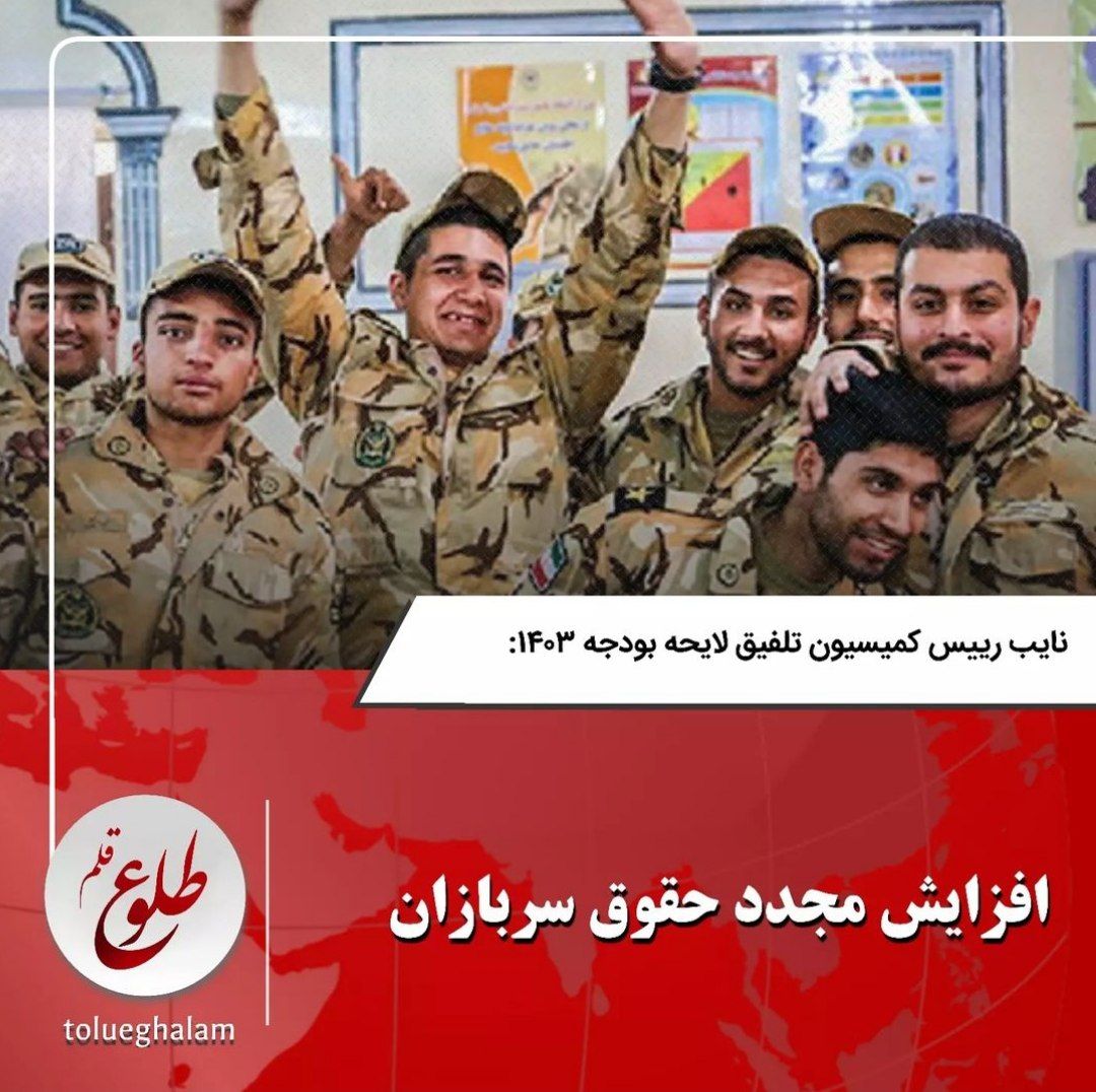 با تلاش همکاران ما در مجلس بالاخره آخرین تغییرات حقوق سرباز نیز در جداول قانون بودجه ۱۳۰۳ اصلاح شد و ۶ هزار میلیارد تومان منابع جدید برای افزایش حقوق سربازان اضافه شد تا در مجلس انقلابی یازدهم حقوق این عزیزان بیش از ۲۰ برابر رشد کرده باشد. سربازان متاهل که خدمت سربازی خود را در مناطق عملیاتی میگذارند در فروردین ۱۴۰۳ حداقل معادل ۱۰ میلیون و ۲۲۰ هزار تومان حقوق دریافت کردند ولی با اعتبارات مصوب شده در مجلس در بودجه برای این امر حداقل حقوق اردیبهشت سربازان معادل ۱۱ میلیون و ۵۳۵ هزار تومان خواهد بود.